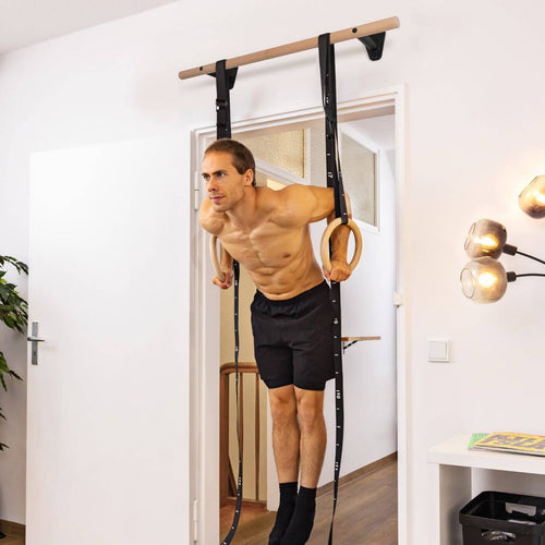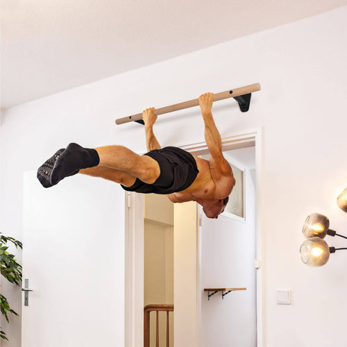 The wooden pull-up bar is mounted above the door frame, in hallways or on stable beams to save space. It allows you to perform a wide variety of exercises: classic pull-ups, chin-ups, leg lifts and challenging moves such as front levers or L-sit hangs. In combination with gymnastic rings or sling trainers, you can make your training even more varied.