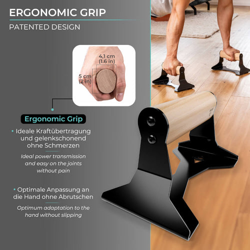 Our ergonomic push-up bars prevent wrist pain from unnaturally kinking your arms as you would with regular push-ups. The joint-protecting push-up bars give you a neutral grip and protect your wrists. The specially developed ergonomic grip is thick enough for an optimal power distribution and power transmission.